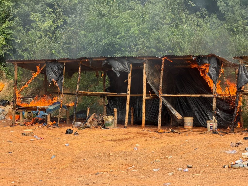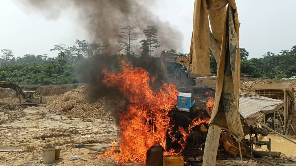 The task force subsequently immobilized the two (2) excavators by detaching one (1) control board from each machine, as well as removing two (2) oil pumps, thereby rendering them inoperable. No monitors were found on the machines at the site. Additionally, two industrial water pumping machines, gold-trapping carpets, and water hoses were found and set ablaze at the site.